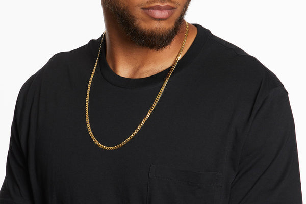 Enhance your collection with our premium 5mm gold Cuban Link Chain - a classic men's necklace known for its ideal weight and shine. This gold jewelry is expertly crafted in Northern Italy using only the finest materials. Each piece is made from pure 925 sterling silver and coated 3 times with genuine 18k gold, resulting in a thickness that is 5 times greater than typical gold plating.