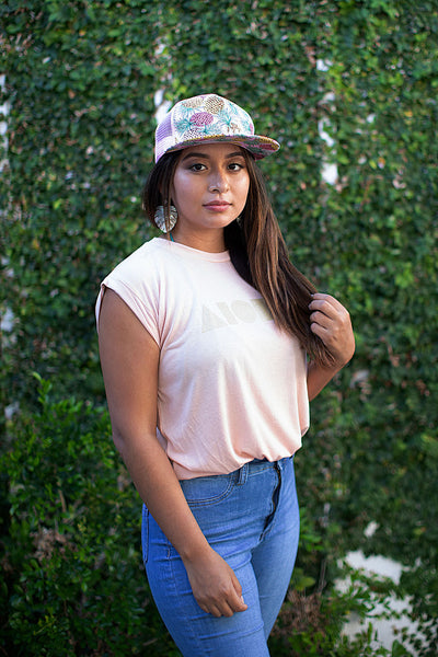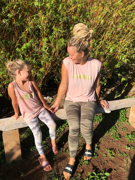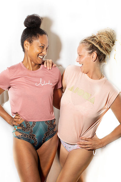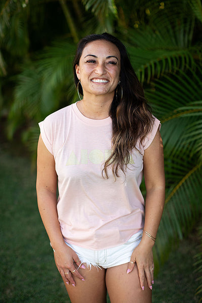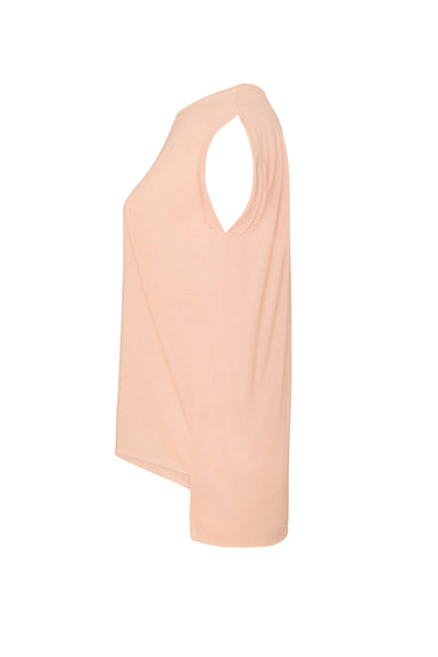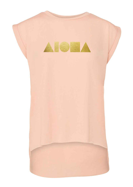 Our women's flowy muscle tee is a feminine take on an old classic. Made of a super soft poly-viscose blend, this t-shirt has a relaxed, draping fit. The high in front, low in back bottom hem gives it a unique flare along with rolled sleeve cuffs to complete the look. Hand screen-printed on front with our metallic gold logo.