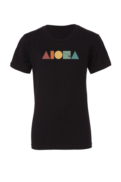 This youth tee is made from a super soft cotton/polyester blend. Screen printed on the front with our Retro Rainbow Aloha logo with the chain of Hawaiian islands inside of the "H" square. This logo color combo is a retro take on our infamous Rainbow Country logo, our very first iteration of our Aloha Shapes® when we started the brand back in 2012.