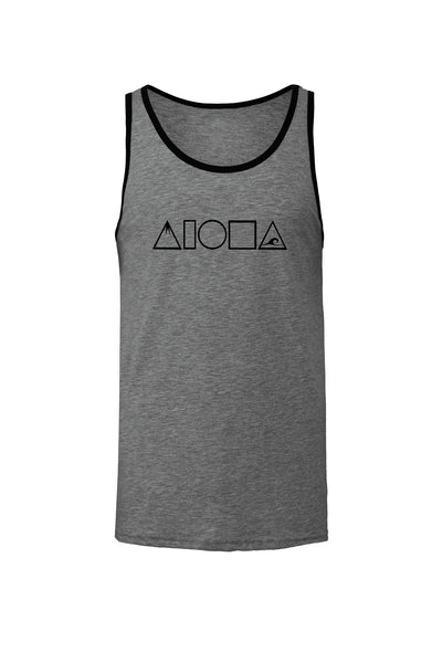 Unisex tanktop in dark heather grey screen printed with Mauka to Makai Aloha Shapes logo in black on front chest. Neck and armholes in contrasting black
