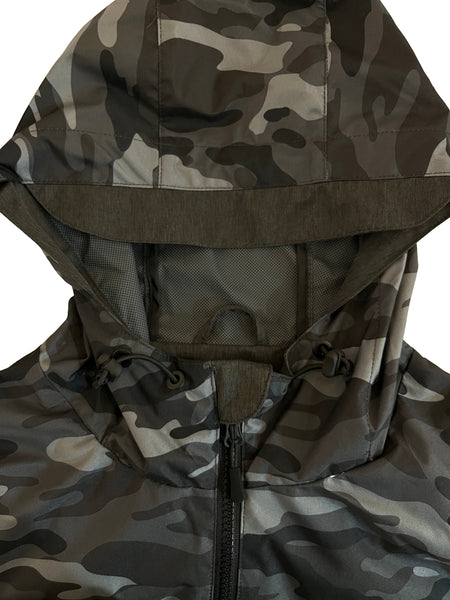 Stay warm, be wild, and keep dry! The "Major" Water Resistant Jacket is here to help you do all three. Get ready to shred your way through any rain with this life-saving layer! Pockets in all the right places. Greyscale camo on top half and solid black on the bottom. Circle