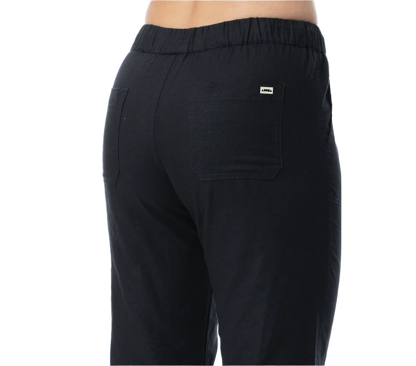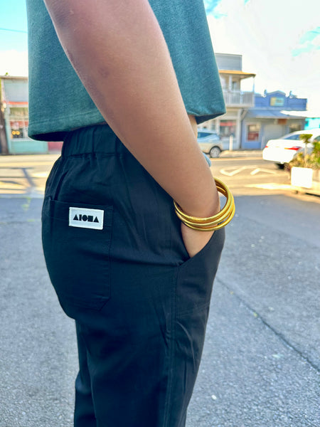 The perfect pair of comfortable lightweight pants: lightweight, breathable and super cute! Black cotton pant and waistband. Natural woven
